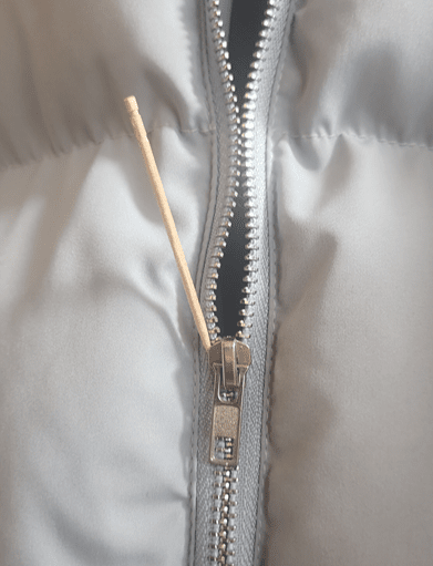 지퍼가 잘 안 잠기거나 뻑뻑할 때, 이쑤시개로 지퍼 이빨 사이를 따라가며 실밥, 먼지, 실, 털 등을 꼼꼼하게 제거하세요.