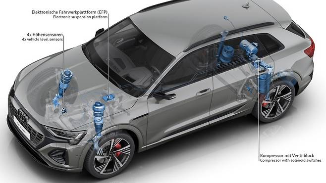플래그십 SUV 시장에서 가장 중요한 가치 중 하나는 바로 ‘최상의 승차감’과 ‘압도적인 정숙성’입니다. 아우디 Q9은 이 두 가지 핵심 가치를 충족시키기 위해 최첨단 기술들을 아낌없이 적용할 것으로 예상됩니다. 특히, 에어 서스펜션의 탑재는 Q9이 노면의 충격을 효과적으로 흡수하고, 다양한 주행 환경에서 최적의 승차감을 제공할 수 있도록 할 것입니다. 이는 벤츠 GLS와 BMW X7이 자랑하는 안락함에 정면으로 도전하는 요소가 될 것입니다. 에어 서스펜션은 차량의 높이를 자동으로 조절하여 고속 주행 시 안정성을 높이고, 오프로드 주행 시에는 지상고를 확보하여 험로 주파 능력을 향상시키는 등 다재다능한 기능을 수행합니다.