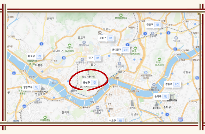 그렇게 필터링하니, 서울 각 지역에서 경매 물건이 아래와 같이 표기됐어요. 정 가운데 남산을 바라보고 있는 용산구를 찍어 봅니다.