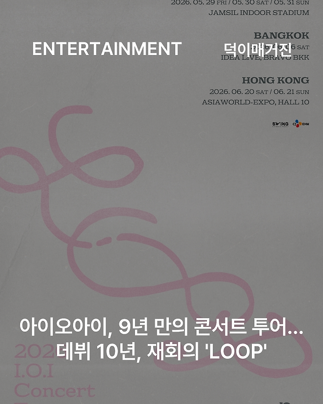 12일 소속사 스윙엔터테인먼트에 따르면 아이오아이는 오는 5월 29일, 30일, 31일 서울 잠실실내체육관 공연을 시작으로 아시아 투어 ‘2026 I.O.I Concert Tour : LOOP’를 개최합니다. 서울 공연 이후 태국 방콕과 홍콩 등 아시아 주요 도시를 순회하며 글로벌 팬들과 만날 계획입니다.