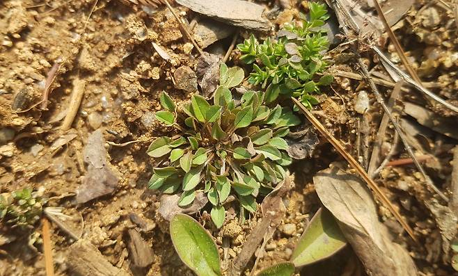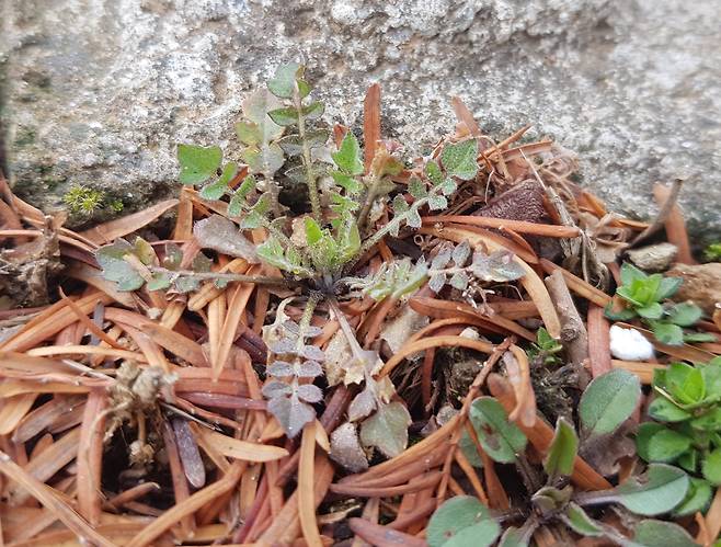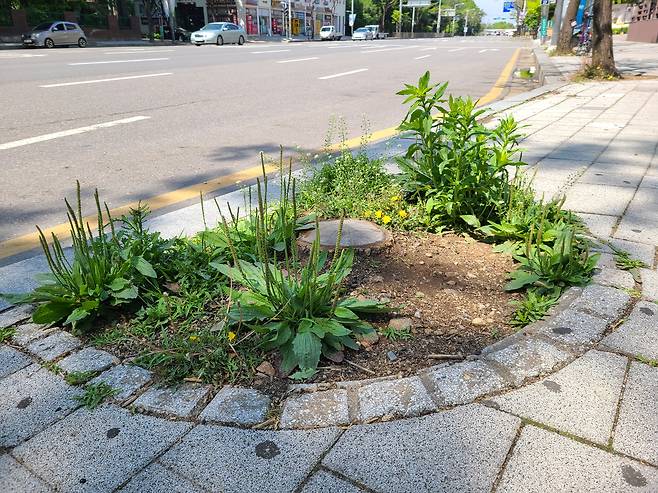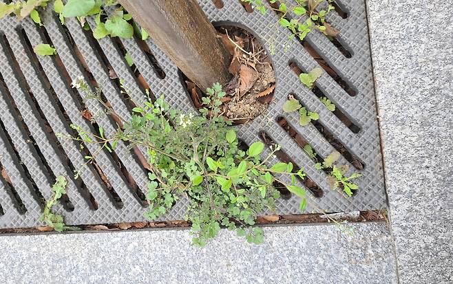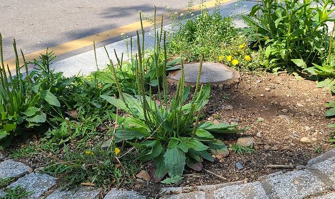 베어진 가로수 화단 틈에서 자라는 로제트 식물