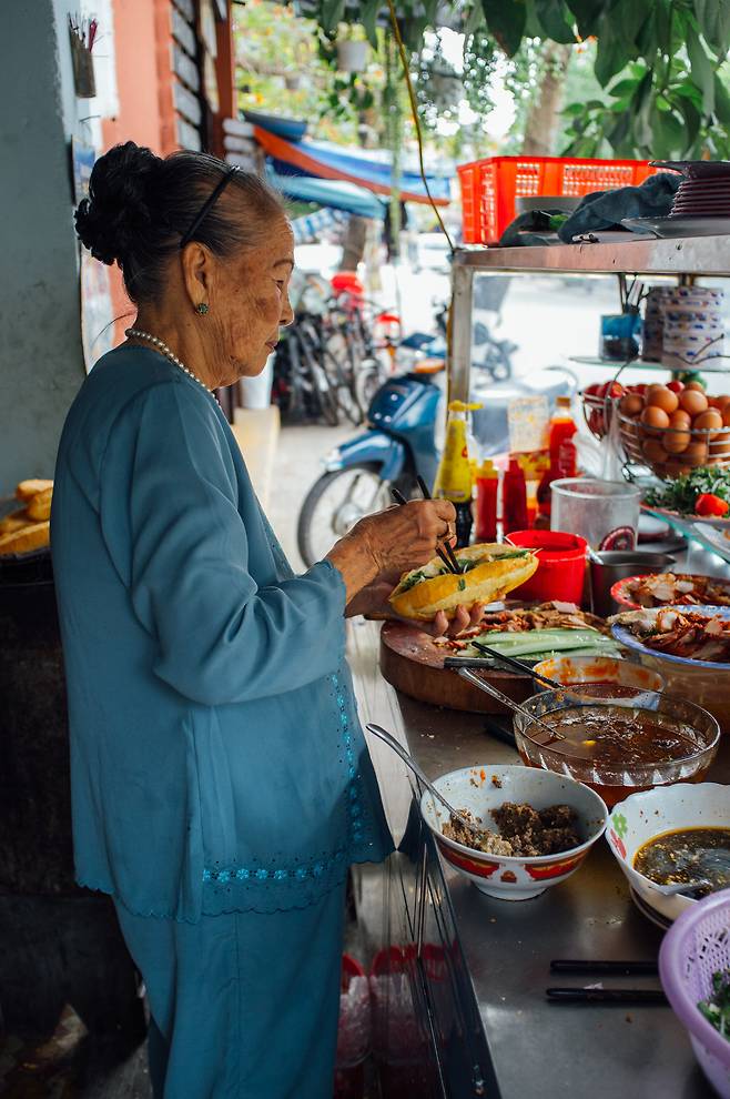 Madam Khanh – The Banh Mi Queen은 할머니가 운영하는 가게로, 해산물, 매콤한 소스, 풍부한 채소가 어우러진 맛이 특징이에요.