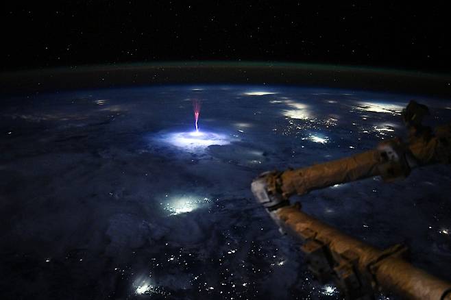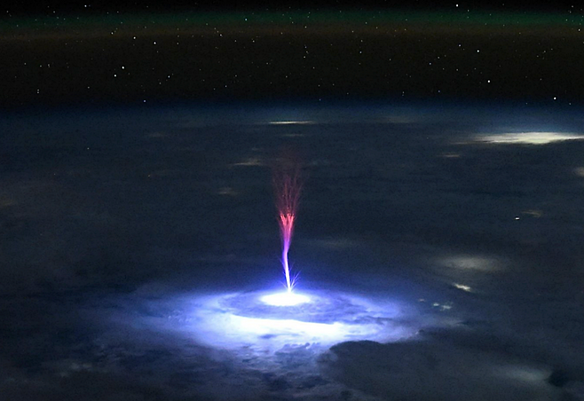 ISS에 체류 중인 니콜 아이어스 비행사는 이달 초 약 400㎞ 상공에서 지구를 내려다보다 멕시코와 미국 상공의 뇌운 속에서 레드 스프라이트를 확인했다. 발달 중인 폭풍 위에 붉은빛이 거꾸로 된 우산처럼 쫙 펼쳐졌다. ISS에서 관측한 덕에 구름에 가로막히지 않은 레드 스프라이트의 전체상을 기록할 수 있었다.
