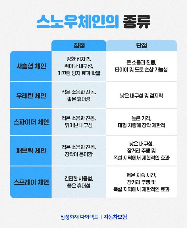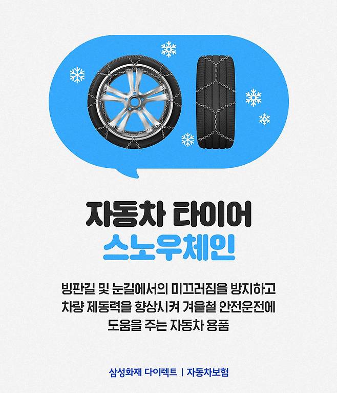 겨울이 되면 자동차를 운행하기 무섭다는 분들이 계십니다. 바로 내리는 눈과 이후 얼어붙은 빙판길 때문인데요. 한번 미끄러지면 속수무책으로 당할 수밖에 없는 겨울철 눈길과 빙판길. 이럴 때 필요한 것이 자동차 타이어 스노우체인입니다. 스노우체인을 차량에 장착한다면 겨울철 빙판길 사고를 예방할 수 있는데요. 그래서 오늘은 자동차 타이어 스노우체인의 종류와 장착 방법 등 스노우체인에 대한 모든 것을 알려드리려고 합니다.
