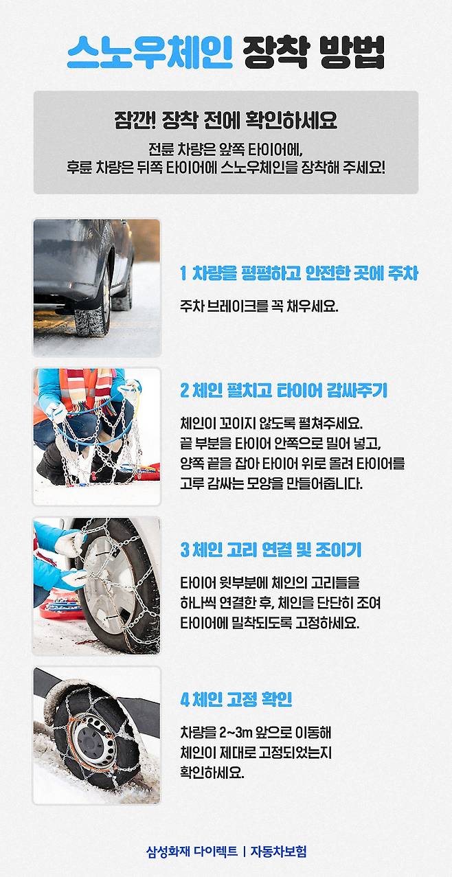 생각보다 간단한 스노우체인 장착법! 겨울철 미끄럼 방지를 위해 꼭 필요한 만큼 이번 겨울 스노우체인을 꼭 구비해 보세요. 단, 스노우체인을 장착했다 하더라도 사고를 예방하기 위해선 속도를 줄이고 안전 주행하는 것이 가장 안전한 방법입니다. 그럼 올 겨울, 스노우체인과 함께 모두들 안전운전 하세요!