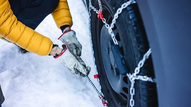 이때 체인의 연결 고리 부분이 타이어 윗부분에 제대로 올라왔다면 각 체인의 고리들을 하나씩 연결해 주세요. 그다음 체인을 단단하게 조여 타이어에 밀착시켜야 합니다. 체인을 장착한 뒤 차량을 살짝 앞으로 2~3m 이동시켜 체인이 제대로 고정되었는지, 헐렁하진 않은지 체크해 주세요!