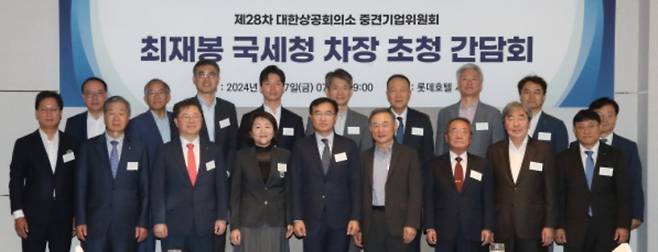 대한상공회의소(회장 최태원)는 지난 27일 서울 롯데호텔에서 최재봉 국세청 차장을 초청해 중견기업위원회를 개최하고 정부에 중견기업계 사업 애로사항과 건의 내용 등을 전했다. 행사에는 종태 대한상의 중견기업위원장을 비롯해 송호근 와이지원 대표이사 회장, 오원석 코리아에프티 회장, 박진선 샘표식품 사장, 김성열 슈페리어 부회장 등 중견기업 대표 및 임원 20여 명이 참석했다.