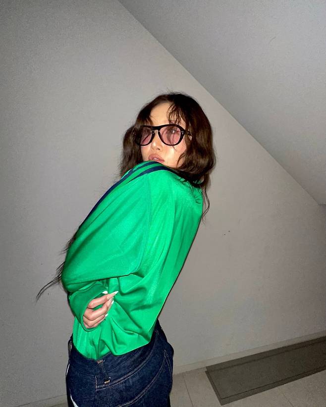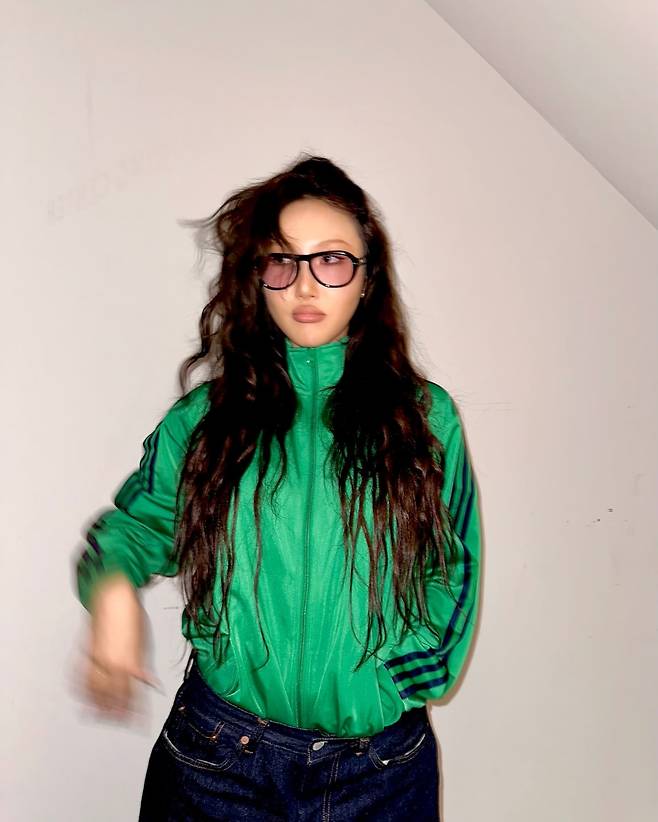 화사가 선명한 그린 컬러의 트랙 자켓을 입고 그녀만의 독보적인 힙한 감성이 돋보이는 사진을 공개했어요.