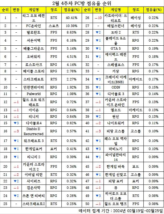 한 주간의 PC방 순위를 되짚어 보고, 어떤 변화가 있었는지 알아보는 'PC방순위' 코너입니다. 데일리게임은 매주 PC방 순위를 일목요연하게 정리, 독자들이 알아보기 쉽도록 제공합니다. 지난 한 주간 어떤 PC 온라인게임들이 눈길을 끌었는지 살펴봤습니다. < 편집자주 >