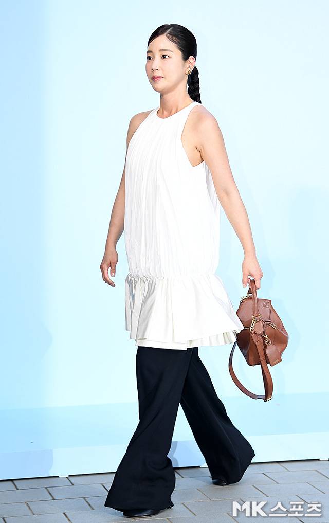 기은세는 깨끗한 화이트 컬러의 슬리브리스 튜닉 톱에 와이드한 블랙 팬츠를 매치해 군더더기 없는 세련미를 자랑했습니다.