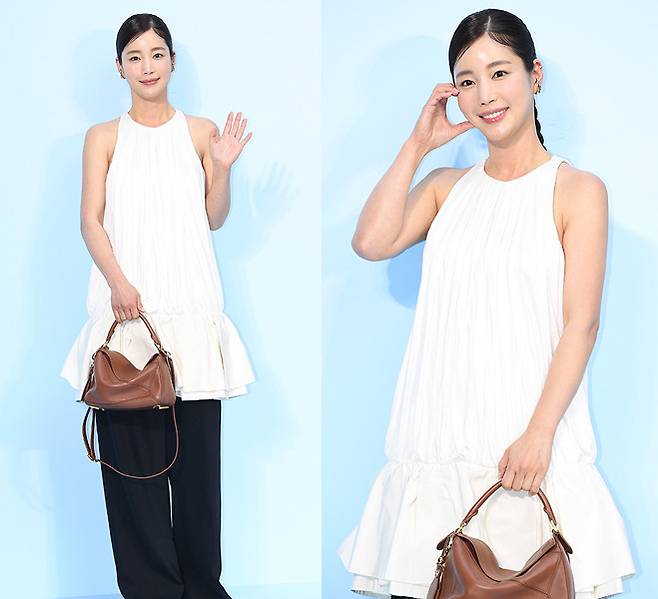 특히 기은세는 갈색 가죽 핸드백으로 룩의 포인트를 줬으며, 깔끔하게 땋아 내린 헤어스타일은 전체적인 분위기를 더욱 우아하게 정리했습니다.