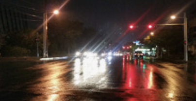 가로등과 신호등 불빛은 아스팔트 바닥 전체에 넓게 퍼져, 어디가 길이고 어디가 차선인지 구분조차 힘듭니다.