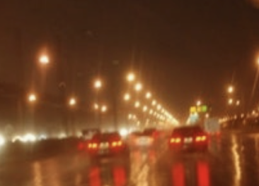 비가 쏟아지는 어두운 밤. 맞은편에서 달려오는 자동차의 헤드라이트 불빛이, 점이 아닌 거대한 '빛 덩어리'로 뭉개져 보입니다.