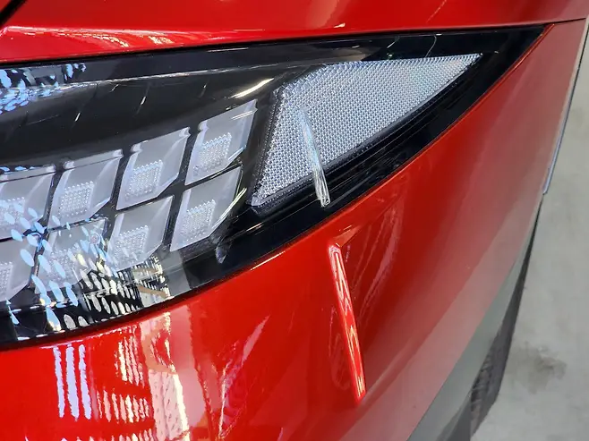 번호판 숫자 5의 좌측을 보면 범퍼옆면에 조그마한 구멍이 보입니다. 이 곳을 에어커튼이라 부릅니다. 예전에는 뭔가 스포티해보이거나 정밀하게 설계된 느낌을 주기 위해 이러한 곳을 가짜로 만드는 경우들이 있었지만 적어도 아이오닉6에서는 아닙니다. 이는 상시 개방된 곳으로 에어 플랩이 닫혀도 늘 열려 있으므로 상시역할을 하게 됩니다.