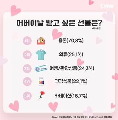 이는 롯데멤버스 자체 리서치 플랫폼 '라임'(Lime)이 지난 11∼12일 전국 20∼60대 남녀 2천명을 대상으로 어버이날 선물에 대한 설문을 한 결과다. 어버이날 받고 싶은 선물(복수 응답)은 용돈(70.8%)이 압도적인 1위에 올랐고 의류(25.1%), 여행·관광상품(24.3%), 건강식품(22.1%), 카네이션(16.7%) 순이었다.