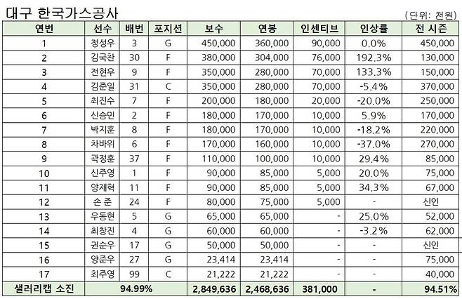 가스공사는 지난 시즌 예상을 깨고 5위를 차지한 뒤 수원 KT와 6강 플레이오프에서 아쉽게 2승 3패로 졌다. 팀 통산 두 번째 플레이오프 무대를 밟은 가스공사는 이번 시즌 샐러리캡 94.99%를 소진했다. 지난 시즌 94.51%와 비슷하다.