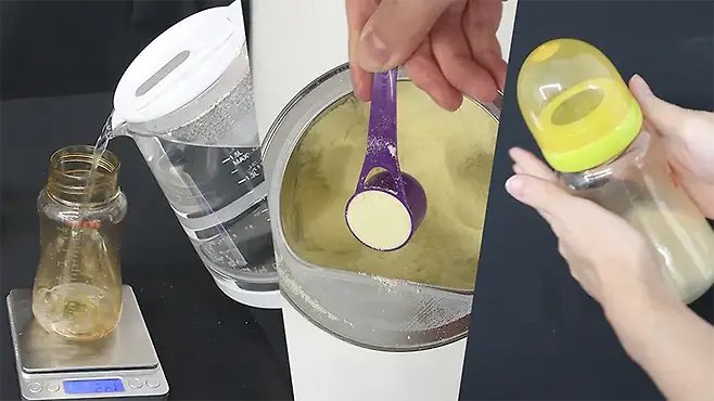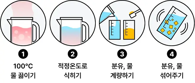젖병의 눈금에 맞추어 물을 담고, 스푼으로 분유를 떠서 물에 넣고 흔들어줘야 합니다.