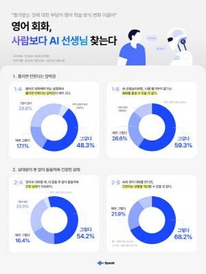 “AI 선생님에겐 틀려도 된다” AI 영어 학습 솔루션 ‘스픽’을 운영하는 스픽이지랩스코리아가 자체 설문조사를 실시한 결과 10명 중 7명은 “평가받는 것에 대한 부담으로 인해 사람보다 AI 선생님을 찾는 것”으로 나타났다. 스픽이지랩스코리아가 지난달부터 만 20세에서 50세 사이의 스픽 국내 유저 1179명을 대상으로 설문조사 결과다. ‘영어로 대화해야 하는 상황에서 틀리면 안 된다는 압박감이 크게 작용하는가’를 묻는 질문에 응답자의 17.1%가 ‘매우 그렇다’, 48.3%가 ‘그렇다’고 답했다. 이어 응답자의 85.9%는 ‘AI 선생님이라면 나를 평가하지 않으니 영어 회화를 즐길 수 있을 것 같다’라고 답했다.