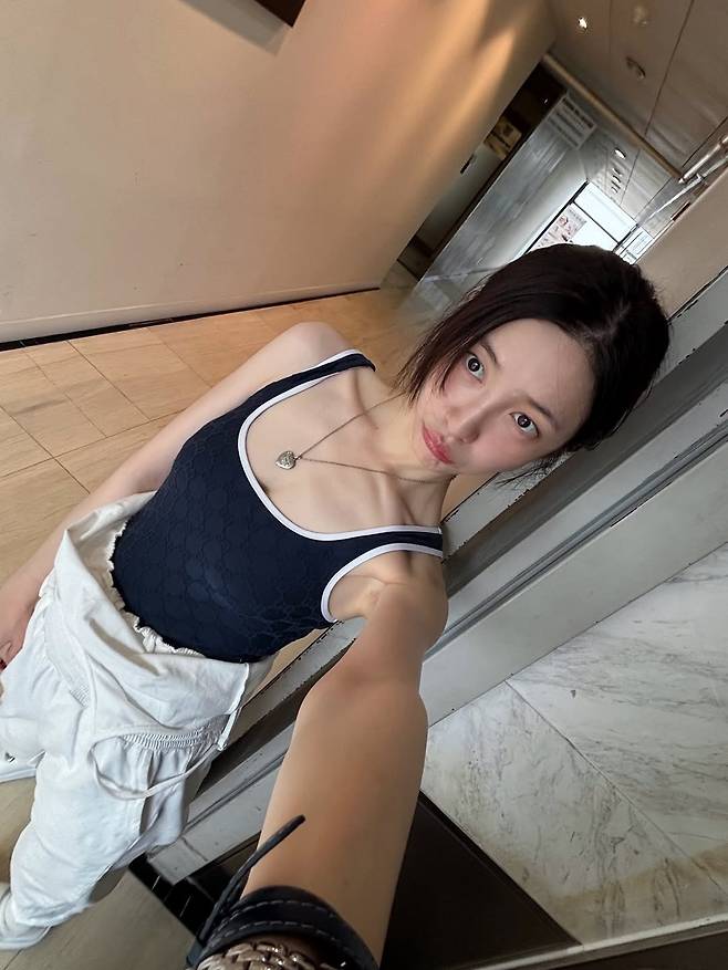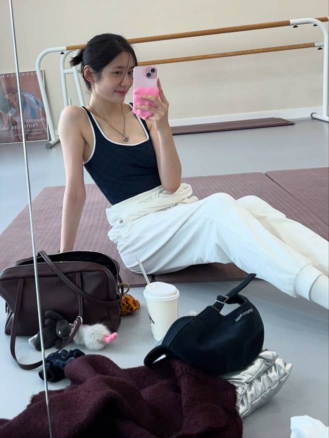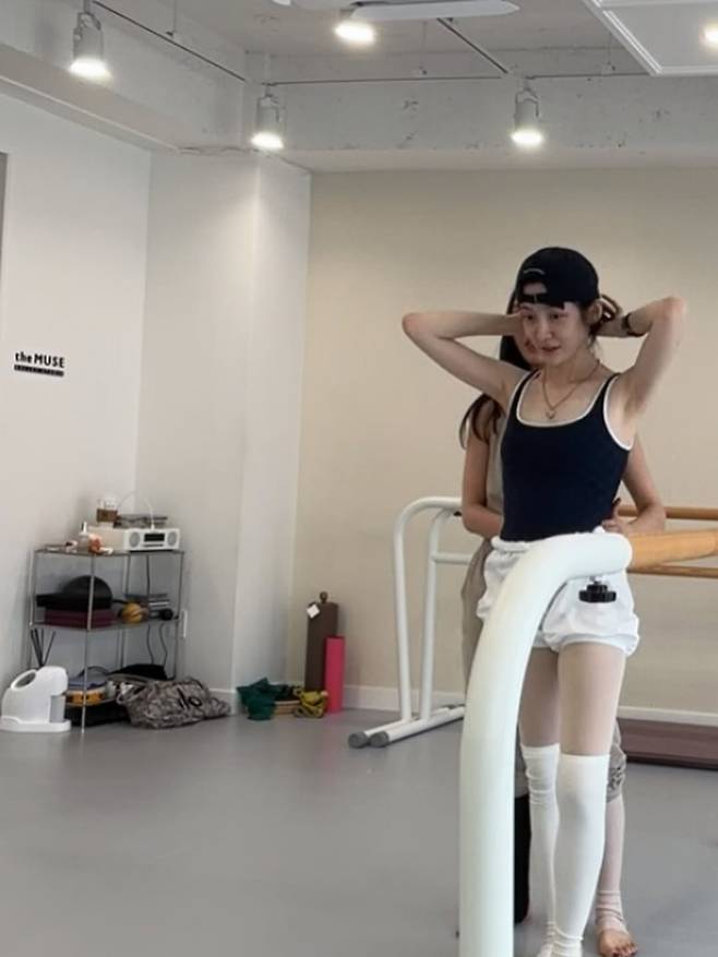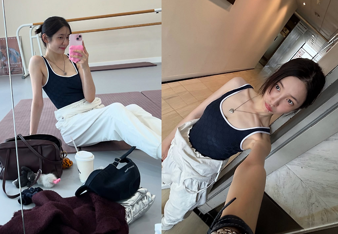 사진 속 박지현은 몸에 밀착되는 네이비 색상의 레오타드에 화이트 조거 팬츠를 매치, 편안하면서도 세련된 '발레코어룩'을 선보였다.
