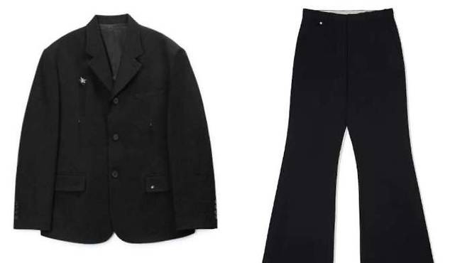 첫 번째 착장은 무대 행사에서 착용한 올블랙 셋업이다. 착용 제품은 에스티유(STU)의 ‘Button Diagonal Zipper’ 재킷과 ‘Flared Diagonal Wool Slacks’ 팬츠다. 재킷은 싱글 3버튼 형태이며 라펠이 짧고 각이 완만하다. 왼쪽 라펠에는 별 모양 브로치가 부착돼 있다.