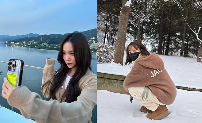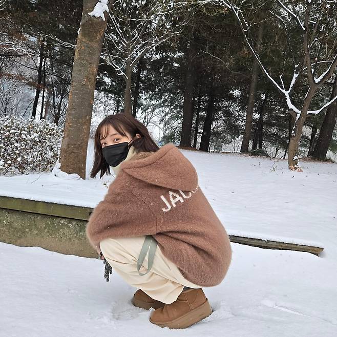 눈 덮인 겨울 풍경 속 윤소희는 브라운 컬러의 니트 후드와 크림색 팬츠를 조합해 따뜻하고 포근한 느낌을 자아냈다. 니트 후드의 부드러운 텍스처와 자연스러운 핏은 겨울철 아늑함을 강조하며, UGG 스타일 부츠를 더해 실용성과 패션을 모두 잡았다. 전체적으로 차분한 톤의 색감이 자연과 조화를 이루며 편안한 분위기를 연출했다.