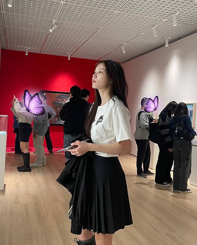 윤소희는 전시 공간에서 화이트 티셔츠와 블랙 플리츠 스커트를 매치해 모던하면서도 단정한 룩을 완성했다. 티셔츠의 심플한 디자인과 스커트의 클래식한 주름 디테일은 미니멀리즘과 우아함을 동시에 표현하며, 블랙 재킷을 손에 든 모습은 실용성과 스타일을 함께 고려한 선택으로 보인다. 전시 공간의 예술적 분위기와 그녀의 패션이 자연스럽게 어우러진다.