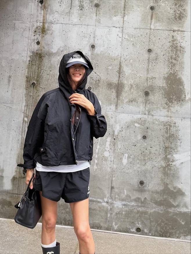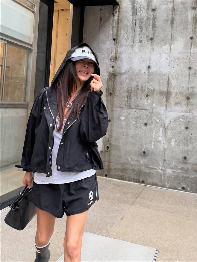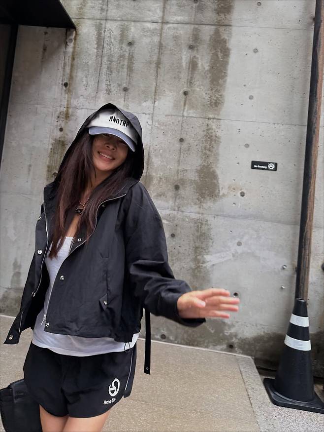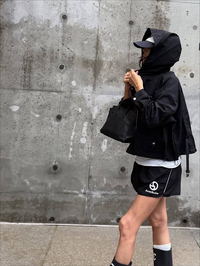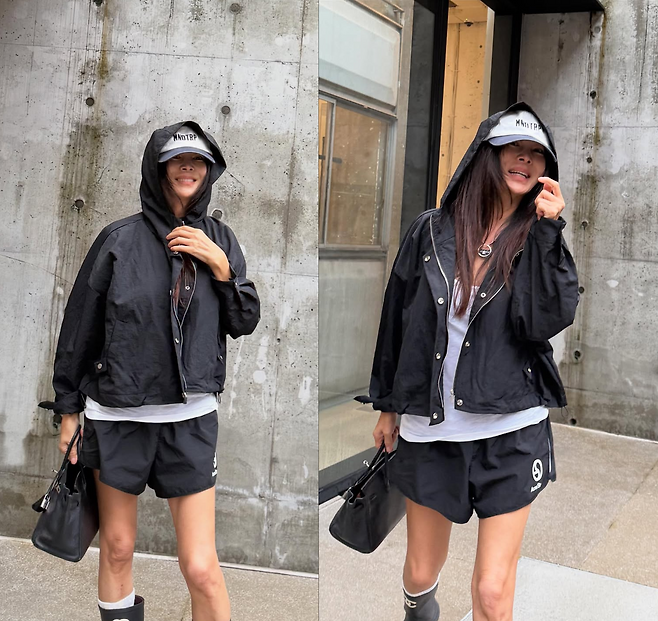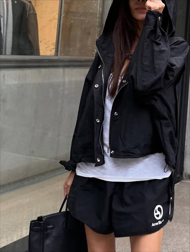 그녀의 패션은 블랙 후드 집업 재킷과 화이트 티셔츠, 그리고 블랙 쇼츠 조합이었다.