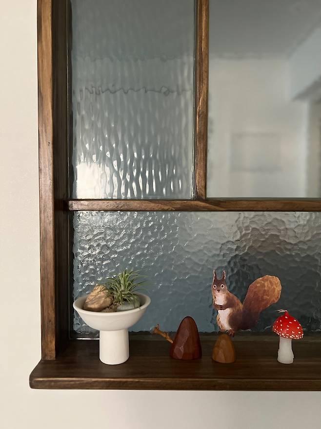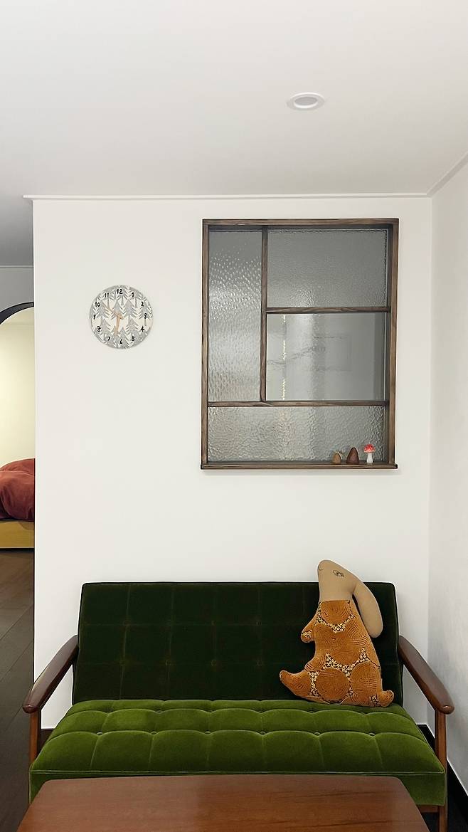 가벽에 창은 바닥컬러에 맞춰 목공방에서 특별 제작해주신 덕분에 제 취향이 반영된 빈티지한 디자인에 프레임마다 각각 다른 유리들로 만들 수 있어서 너무 좋았어요. 거실 쪽 창에는 창가처럼 선반을 넣어서 계절에 따라, 기분에 따라 이런 저런 소품들을 올려둘 수 있도록 제작해주신 점도 센스 만점!