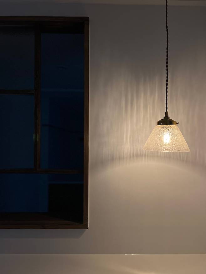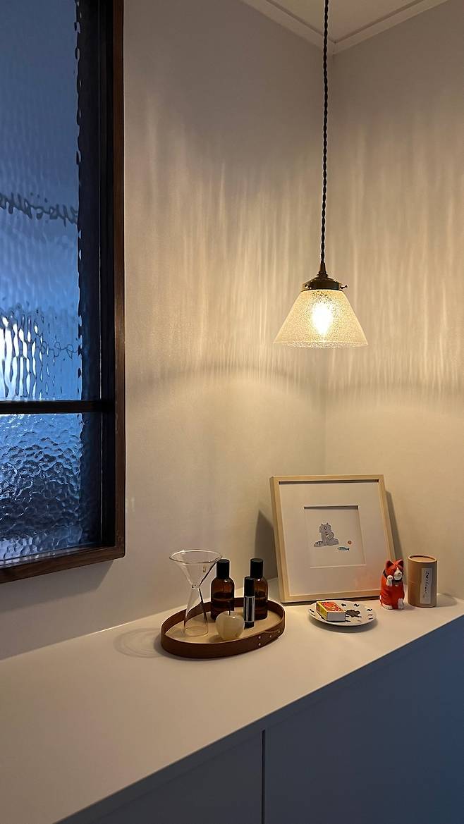 조명이 켜질 때 마다 퍼지는 유리 기포 잔상이 창가 유리와 어우러지면 현관 분위기를 더욱 아름답고 부드럽게 만들어줄 것 같아서 꼭 이 조명으로 하고 싶었어요. 작가님이 하나하나 수작업으로 만드는 제품이다보니 워낙 구하기 어려운 아이템이라서 검색을 거듭하다가 운 좋게 딱 하나 남은 것을 발견해서 바로 구매!