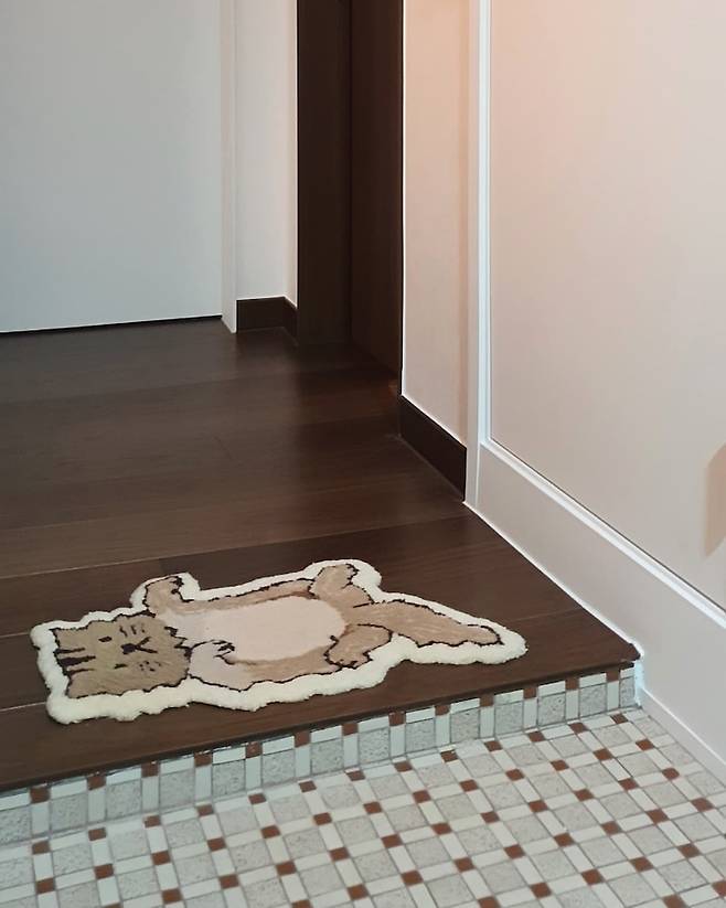이 곳이 <킷사 산시로>라는 느낌이 물씬나도록 제가 터프팅으로 직접 만든 산시로 러그를 현관에 깔아두었는데 러그도 톤이 잘 어우러져서 만든 보람을 느꼈어요. 현관 타일은 인테리어하면서 가장 단시간에 정한 아이템인데 다크 월넛 바닥재와 톤도 패턴도 너무 잘 어울리고 포인트도 되어서 볼 때마다 기분이 좋아져요.