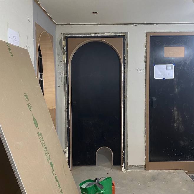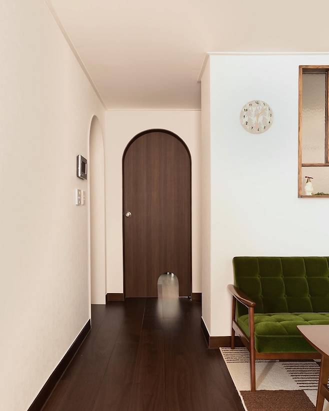집 전체 분위기를 좌지우지하는 중요한 요소인 문. 저는 평소에 근대 건축물의 아치형 창이나 문을 보며 아름다움을 느끼던 사람이라서 인테리어를 구상할 때 방문은 꼭 아치 형태로 하고 싶었고 산시로 전용문도 만들어주고 싶었어요.