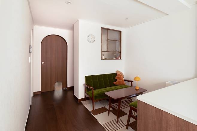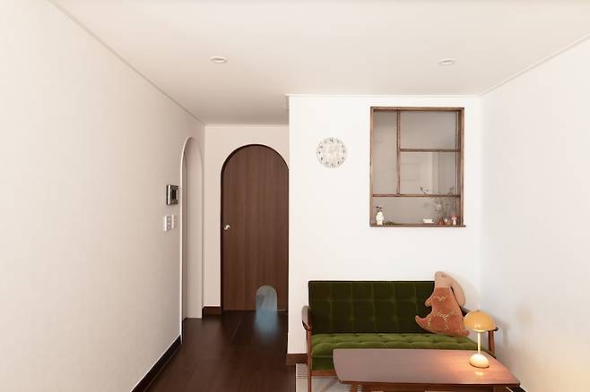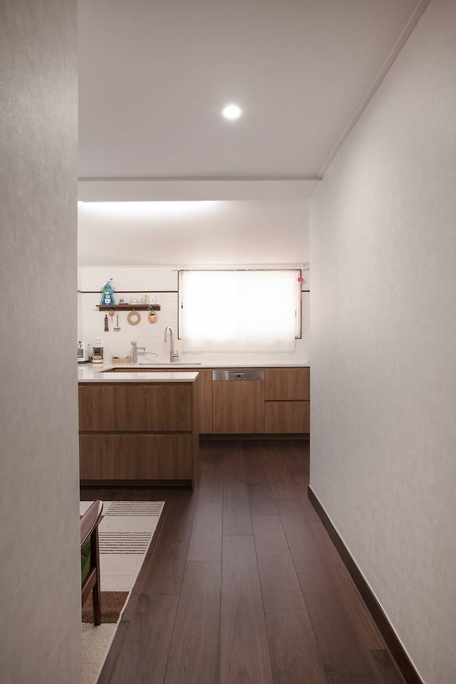 처음에는 공간을 분리하면 너무 좁아보이지 않을까 염려 했지만 현관을 지나 거실로 왔을 때 확장성도 느껴지고, 광폭 마루가 더해져서 시원한 복도 느낌도 낼 수 있었어요. 가벽에는 창을 크게 만들어서 답답함도 해결했답니다.
