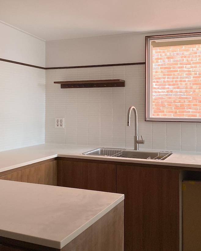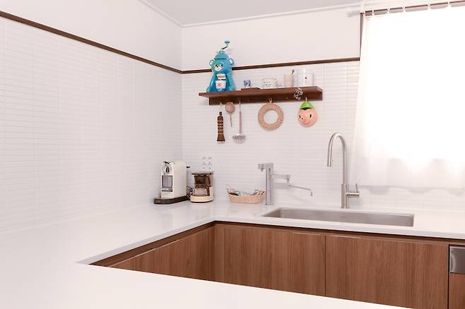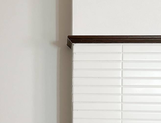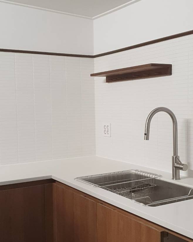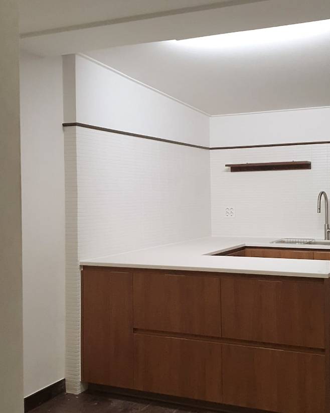 결국 상부장을 없애기로 결정했고 탁트인 벽은 화이트 타일을 세로로 시공하는 인테리어가 너무 유행이라서 가로 시공으로 차별화를 두었고, 바닥 컬러에 맞춰 공방에서 제작한 원목 몰딩으로 타일과 벽지의 경계를 마감해서 포인트가 되도록 했어요.