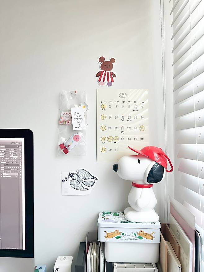 업무 공간에는 가능한 최소한의 물건들만 두고 심플하게 지내고 싶어서 자주 쓰지 않는 물건들은 모두 서브룸에 두었지만 그 때 그 때 엄선하여 귀여운 물건들은 책상 한켠에 자리를 내어주고 있습니다.