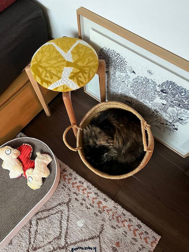 그러다보니 산시로 물건들이 차지하는 비중이 높아서 산시로 화장실이나 식사공간 등은 심플하면서 인테리어에 잘 녹아들 수 있는 제품들로 구매하고 있어요. 가끔 제가 직접 만들어주기도 하는데 특히 라탄바구니는 꿀잠 장소로 자주 사용해주고 있어요.