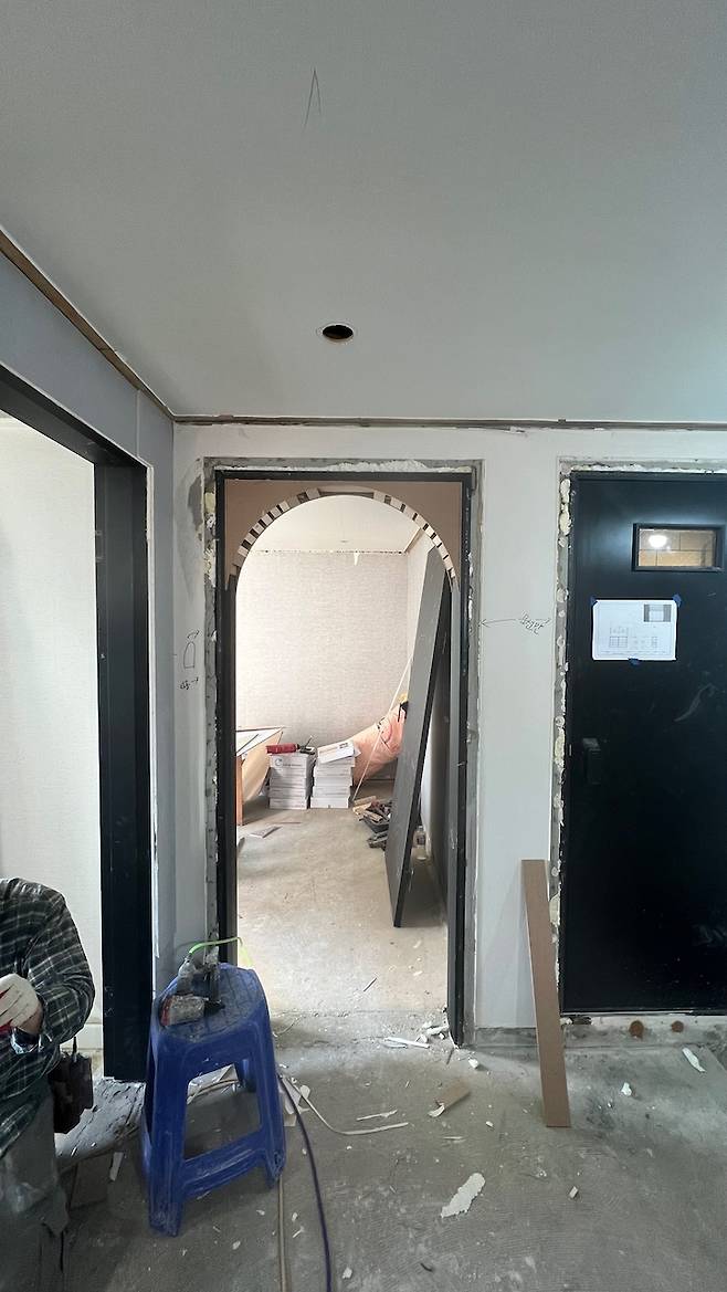 우선 두꺼워서 답답해 보였던 기존 문틀을 9mm로 변경하면서 아치형태로 틀을 새로 짰고, 문짝은 원래 문을 활용하되 필름만 바닥컬러와 맞춰서 마감했어요. (이렇게 하면 거실에서 보면 아치문이지만 방 안에서 보면 네모문이 됩니다)