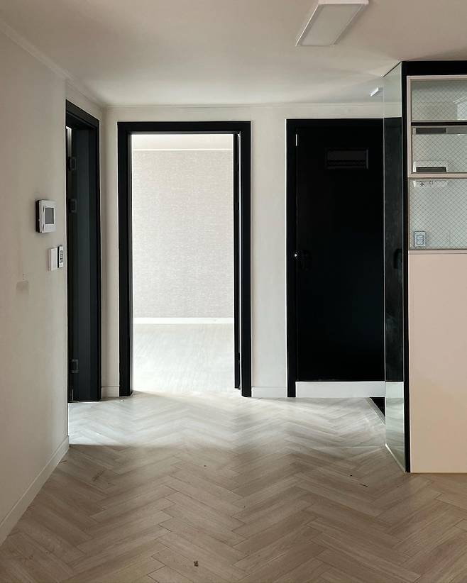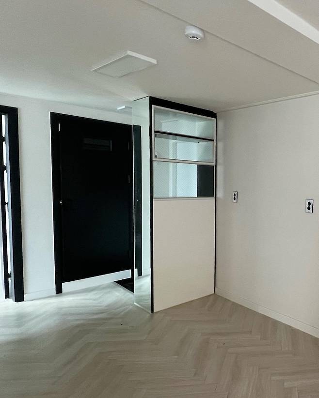 로망 중 하나였던 중문. 하지만 현실은 그리 호락호락하지 않았어요. 현관이라고 할 것도 없는 소형 구축빌라 구조상 중문은 그저 해태같은 존재일 뿐... 그래도 현관을 평범하게 가기에는 너무 아쉬웠는데 실장님이 역발상 아이디어로 오히려 이 좁은 부분을 활용해서 짧은 복도처럼 보일 수 있도록 과감하게 가벽을 치자고 제안해주셨어요.