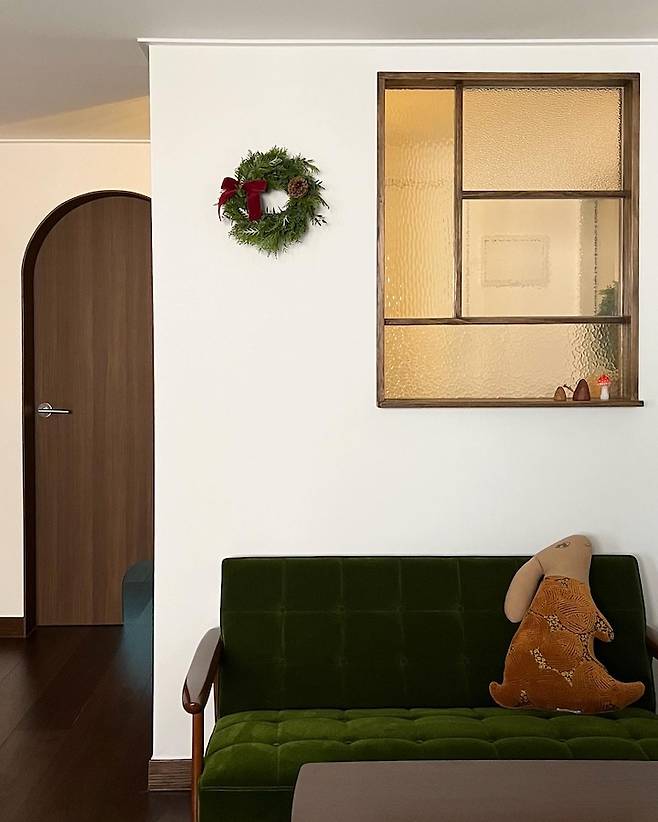 그리고 창가 옆 벽면은 무얼 걸어두어도 어울리도록 여백을 남겨두었는데 일본에서 구매하고 아껴두었던 시계까지 걸어두니 정말 '산시로와 제가 사는 집' 다워진 느낌이었어요. 겨울에는 직접 만든 리스를 걸어두어도 좋은 공간이라서 계절에 따라 인테리어를 바꿔주고 있답니다.