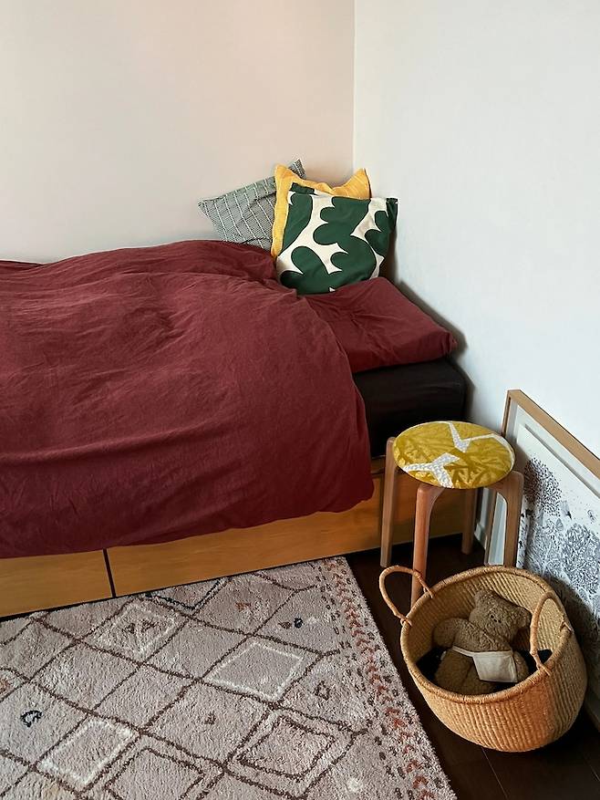 딱 하나 새로 구매한 가구는 침대 옆에 두고 협탁처럼 사용하고 있는 스툴이에요. 마침 인테리어를 하던 시기에 제가 좋아하는 두 브랜드가 콜라보로 스툴을 출시했는데 직접 일본 업체와 메일을 주고 받으며 구매했어요. 배송 과정에 어려움이 있었지만 그만큼 애정하는 아이템으로 손님이 왔을 때는 스툴로도 활약해주고 있어요.