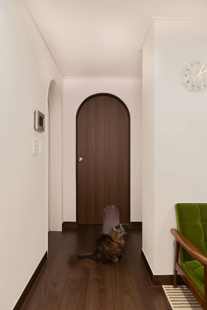 그리고 우리집 인테리어의 하이라이트인 산시로 전용문! 사람 문이랑 맞춰서 아치로 디자인 했는데 그 자체만으로도 너무 귀엽고, 그 사이에 앉아있으면 더 귀엽고, 굳이 문이 열려있는데도 자기 문이라고 거기로 지나갈 때면 더더더 귀여워요.