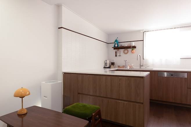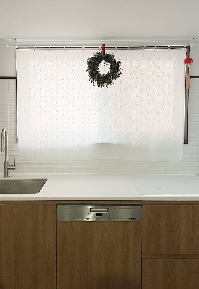 그래서 개수대-식기세척기-인덕션 순서로 정하고, 상부장을 없애면서 후드도 설치하지 않았기 때문에 큰 창이 후드 역할을 대신할 수 있도록 인덕션은 창 앞에 배치했어요.