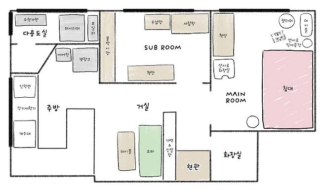 그러다가 사무 공간 겸용으로 쓰기 좋을 만큼 큰 메인 룸과 맥시멀리스트지만 미니멀리스트로 보일 수 있도록 모든 물건을 숨겨둘 수 있는 서브 룸이 있으면서, 요리를 즐겨 하는 제 라이프스타일에 딱 맞게 탁 트인 주방 구조를 가진 이곳을 만나게 되었습니다.