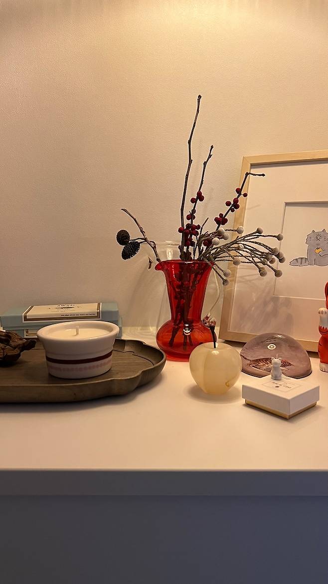 이 곳도 계절과 기분에 따라 소품으로 얼마든지 분위기를 바꿀 수 있어서 좋아하는 공간이에요. 요즘은 빈티지한 무드를 가진 소품들이 좋아서 그런 소품들로 꾸며두었어요.