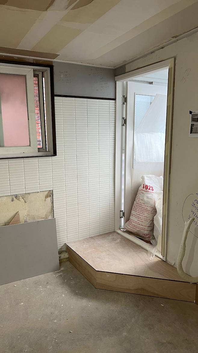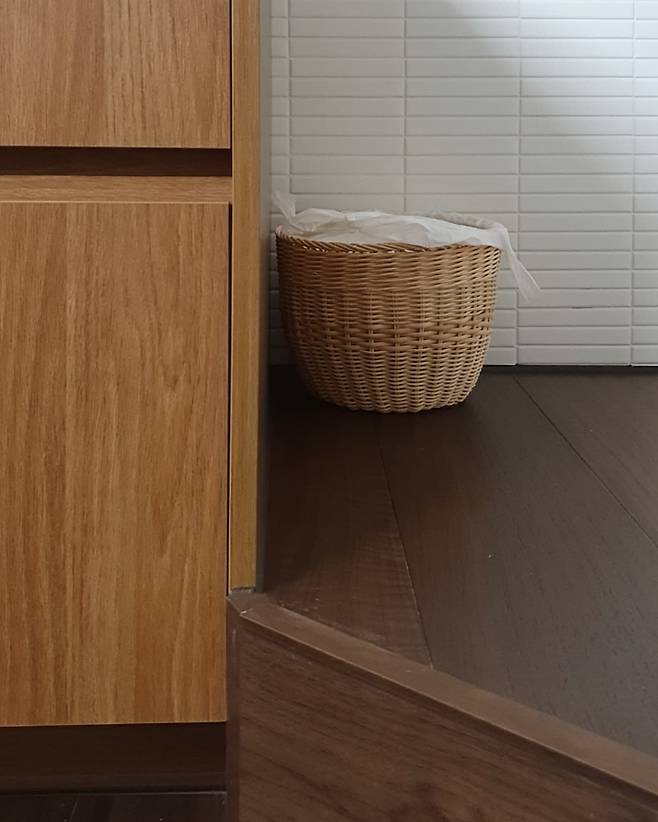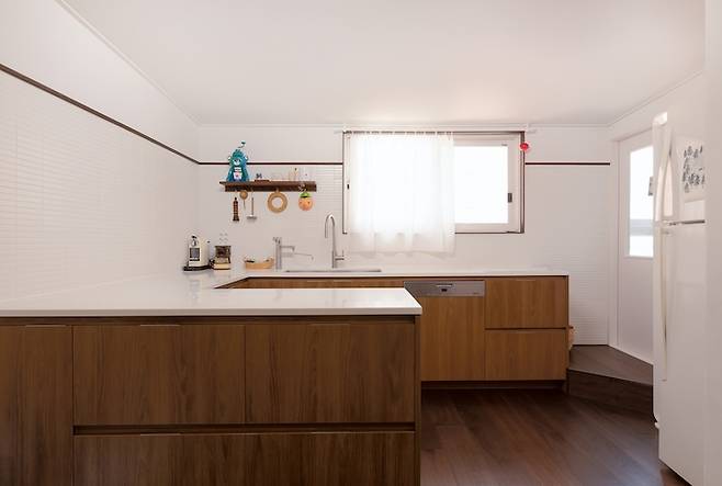 이렇게 시공을 하니 다소 높은 다용도실 문턱과 자연스럽게 연결되면서 오히려 편한 동선이 됐어요.