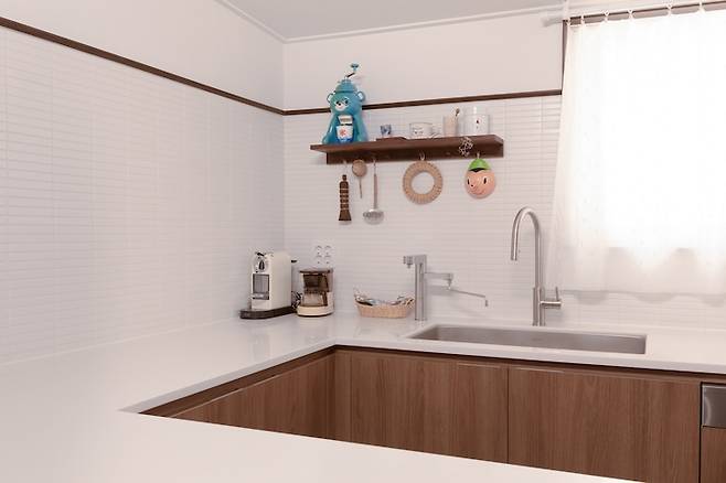 마침 몰딩 컬러와 딱 어울리는 선반도 발견해서 따로 구입한 후 설치만 부탁드렸어요. 선반 위에는 그동안 모아두었던 아기자기한 소품들이나 좋아하는 빈티지 컵들을 올려두고 있는데 주방의 포인트가 되어 좋아하는 공간이에요.