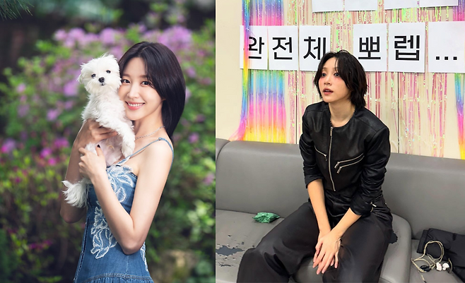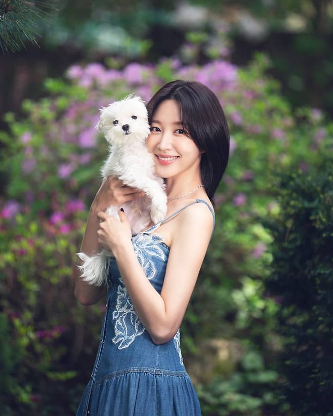 안희연이 푸른 자연을 배경으로 데님 원피스를 입고 화사한 미소를 선보이고 있다. 블루 컬러의 데님 원피스는 가슴 부분의 섬세한 자수 디테일이 돋보이며, 여성스러운 실루엣으로 안희연의 우아한 분위기를 강조하고 있다. 화사한 꽃과 녹음이 어우러진 배경과 함께 그녀가 안고 있는 하얀 강아지는 전체적인 이미지에 생기와 친근함을 더하고 있다.