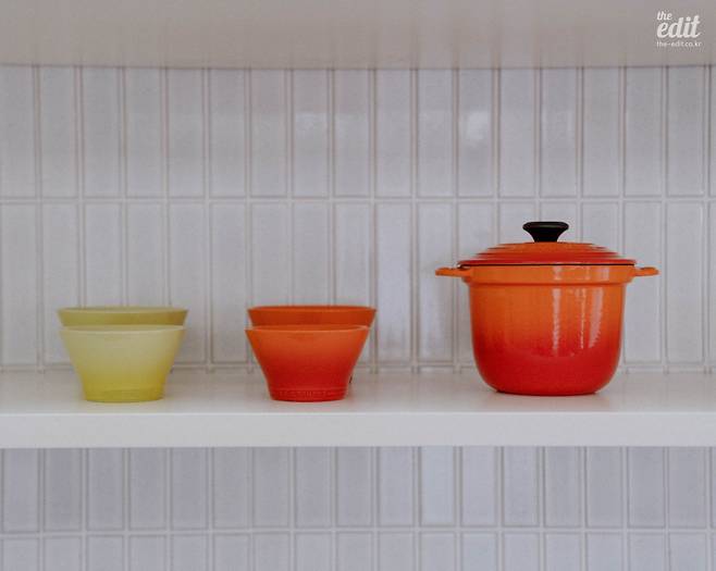 르크루제에는 예쁜 컬러가 많지만, 가장 상징적인 컬러는 역시 최초의 컬러 에나멜이었던 주황색이라고 생각한다. 단숨에 눈길을 사로잡는 쨍하고 선명한 색감. 모서리로 갈수록 점점 물들어가듯 색이 진해지는 그라데이션이 아름답다.
