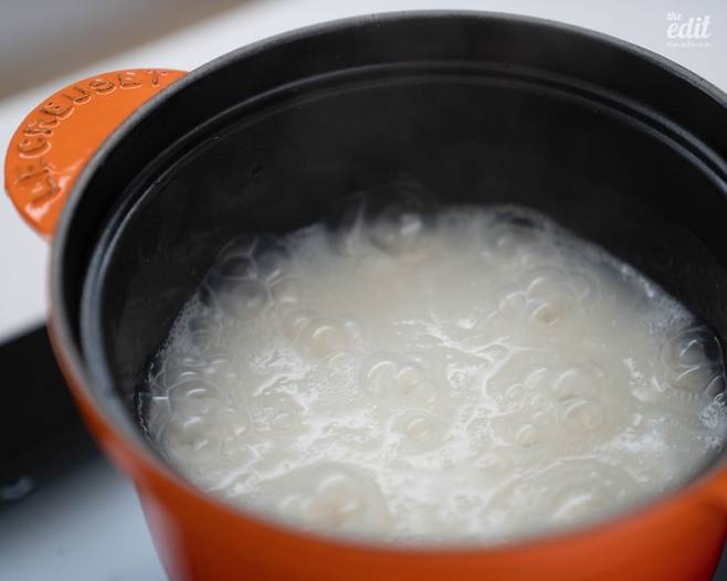 강한 불에서 10분간 끓여준다. 중간중간 저어 주는 것도 좋은 팁. 팔팔 끓어오를 때쯤 수분커버를 닫아주자. 전체 뚜껑을 닫은 상태에서 약한 불로 조절하고 10분 정도 더 끓여 준다. 이후 불을 끄고 15분 정도 뜸을 들여주면 끝! 20분 익히고 15분 뜸을 들여주면 쌀알 한 알 한 알이 탱글하게 익은 밥이 완성된다. 참고로 르크루제 냄비는 가스레인지, 인덕션, 하이라이트, 오븐 등 모든 가열 기기에서 사용 가능하다.