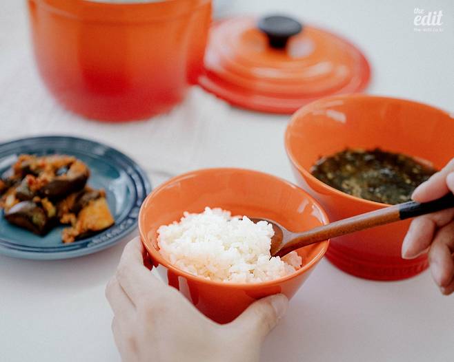 자, 이제 완성된 밥을 맛보자. 향긋하다. 화사한 주황색 르크루제와 흰 쌀밥의 조화라니. 보는 것 만으로도 침이 꼴깍 넘어가는 조합이 아닌가. 갓 지은 쌀밥이라는 건 한국 사람들의 소울 푸드다. 따뜻한 온기가 마음을 열어주고, 솥밥 특유의 찰기와 향 덕분에 입맛을 돋운다. 내가 지은 솥밥 중에 가장 맛있었다. 역시 르크루제다.