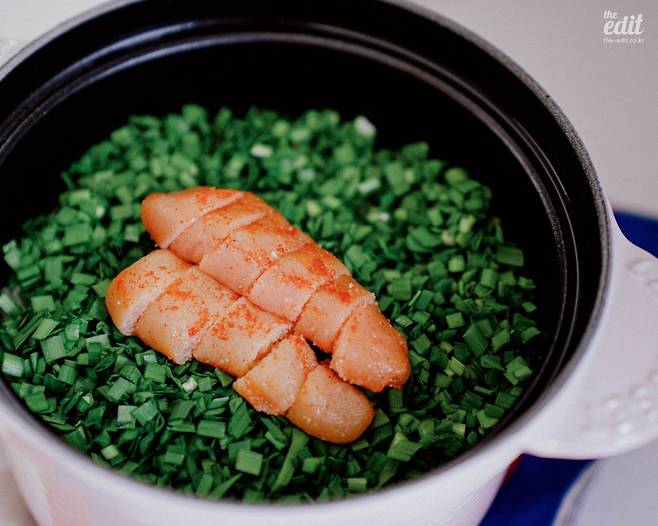 이번 레시피도 똑같다. 쌀을 10분간 끓여주고, 약한 불에 10분, 불을 꺼서 뜸을 들여주면 된다. 불을 끈 뒤에 뚜껑을 열어 밥 위에 명란을 얹어주면 뜸을 들이는 15분 동안 냄비 내부의 열기 덕분에 명란이 알맞게 익는다. 명란과 밥을 잘 섞어서 먹으면 기분 좋은 짭쪼름함과 함께 색다른 풍미를 즐길 수 있다. 취향에 따라 육수를 사용하거나 버터를 넣어주어도, 부추나 실파를 썰어 얹어주어도 좋다.